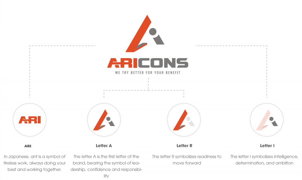 The ARICONS logo is designed in a unique way, with a harmonious combination of shapes and colors creating an impressive logo, carrying the brand story, deeply expressing the values ​​and principles of the business: